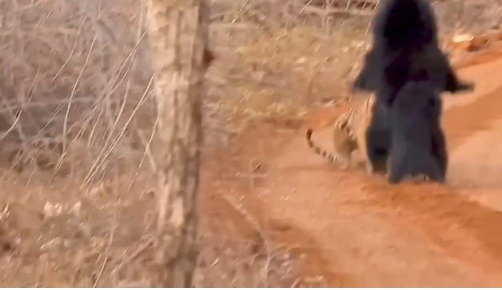 – भालू ने बाघ पर हमला बोला, जिसके बाद “जंगल का राजा” वहां से भाग निकला।
