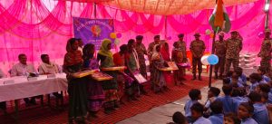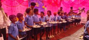 बच्चों को स्कूल ड्रेस, बैग, कॉपी-किताब और स्टेशनरी वितरित की गई।