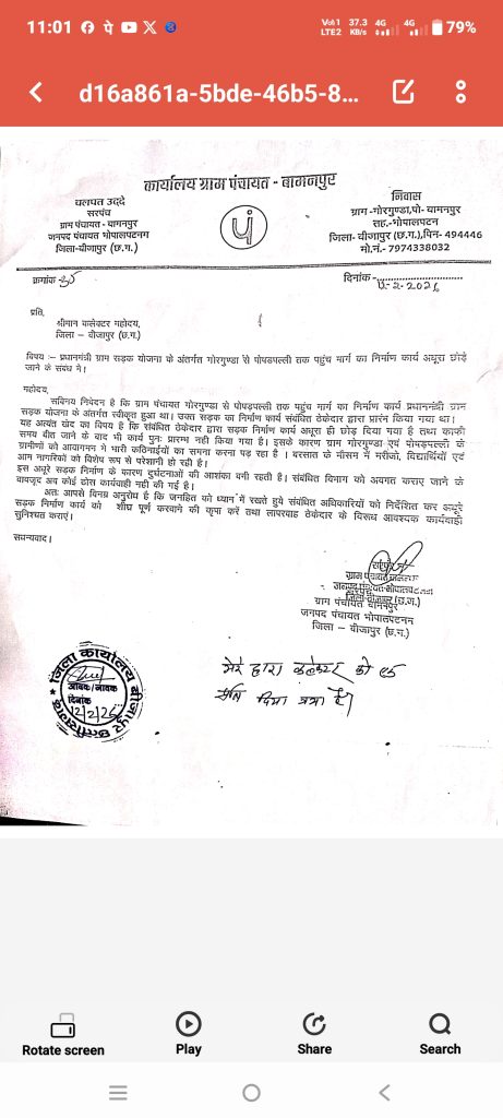 (छत्तीसगढ़): जिले के भोपालपटनम विकासखंड अंतर्गत ग्राम पंचायत बड़नापुर से एक गंभीर मामला सामने आया है, जहां प्रधानमंत्री ग्राम सड़क योजना के तहत निर्माणाधीन सड़क कार्य को अधूरा छोड़ देने की शिकायत की गई है। इस संबंध में ग्राम पंचायत द्वारा कलेक्टर बीजापुर को पत्र लिखकर कार्रवाई की मांग की गई है।